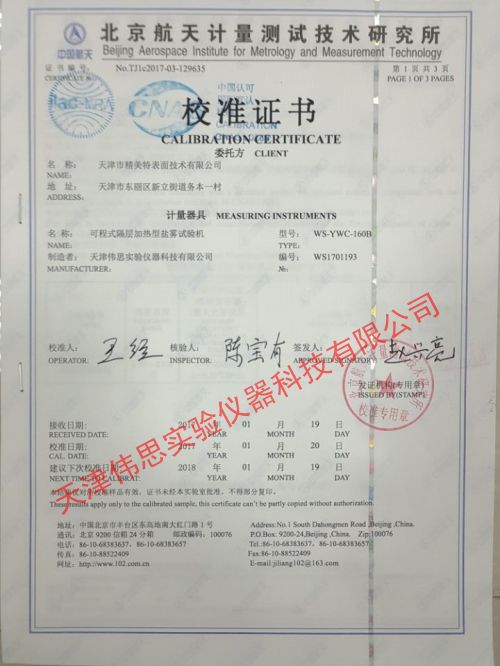 北京航天计量测试技术研究所盐雾试验箱检测报告